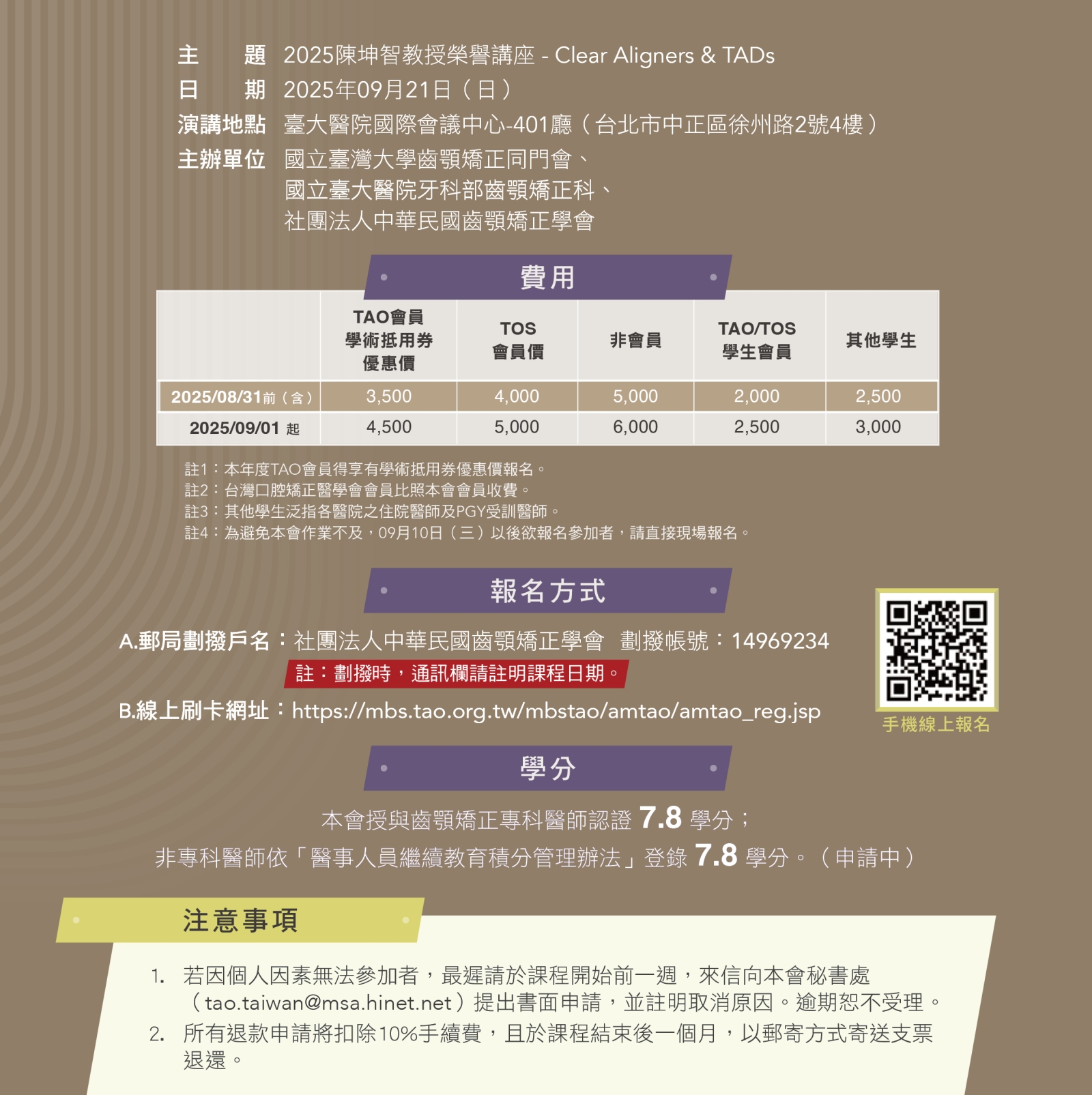 114年08月31日前(含),TAO會員學術抵用券優惠價3,500元、TOS會員4,000元、非會員5,000元、TAO/TOS學生會員2,000元、其他學生2,500元;114年09月01日起,TAO會員學術抵用券優惠價4,500元、TOS會員5,000元、非會員6,000元、TAO/TOS學生會員2,500元、其他學生3,000元。