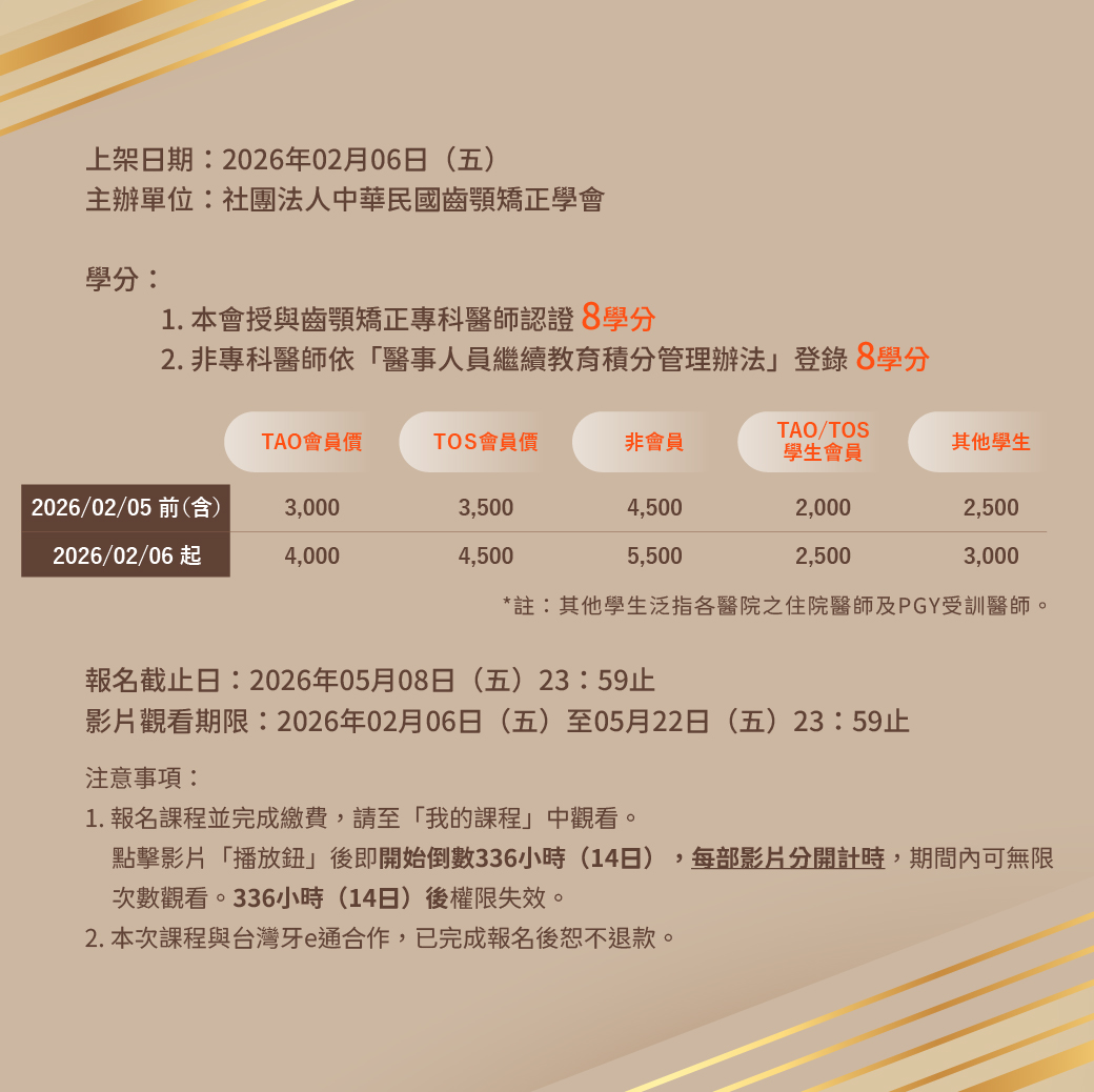 115年02月05日前(含),TAO會員3,000元、TOS會員3,500元、非會員4,500元、TAO/TOS學生會員2,000元、其他學生2,500元;115年02月06日起, TAO會員4,000元、TOS會員4,500元、非會員5,500元、TAO/TOS學生會員2,500元、其他學生3,000元。