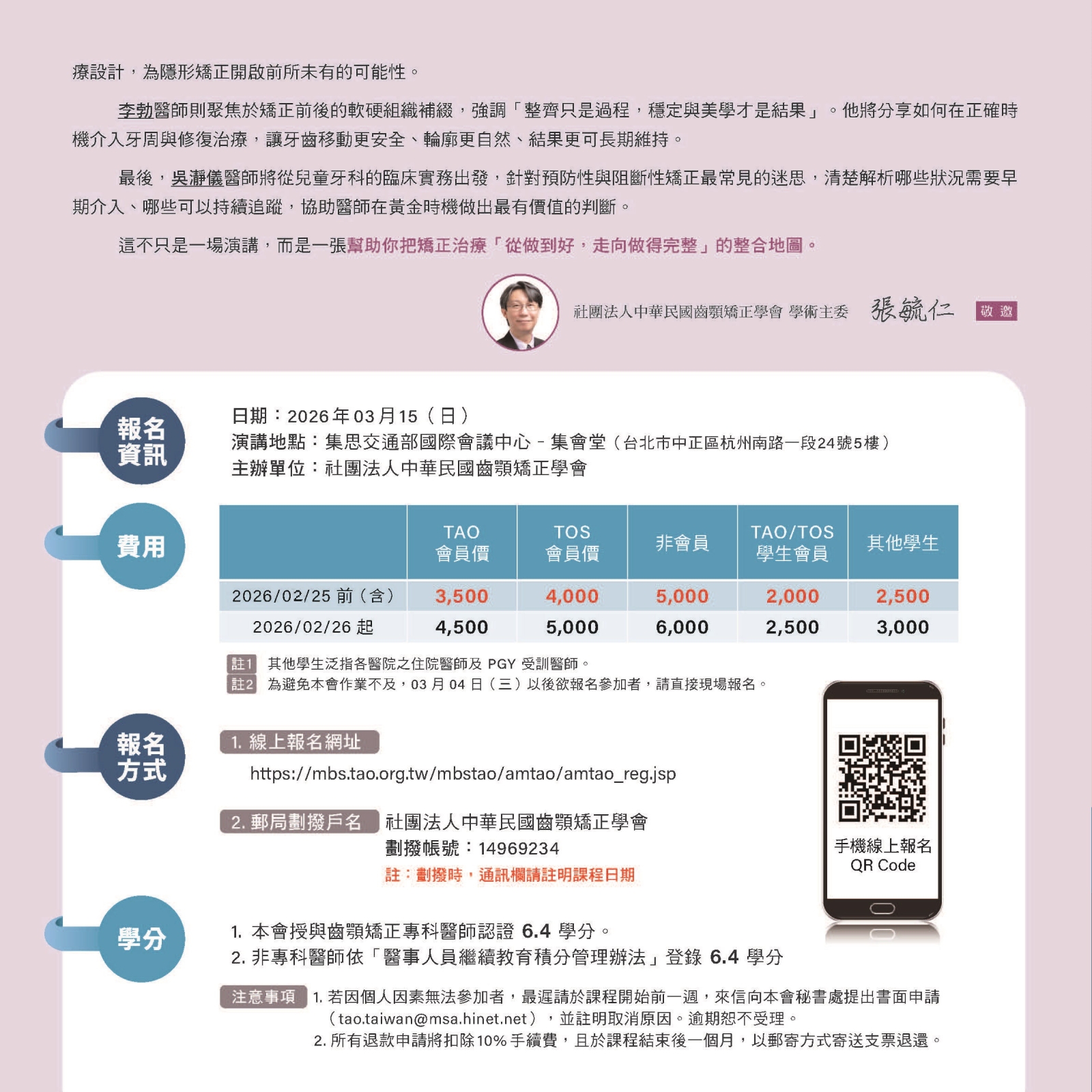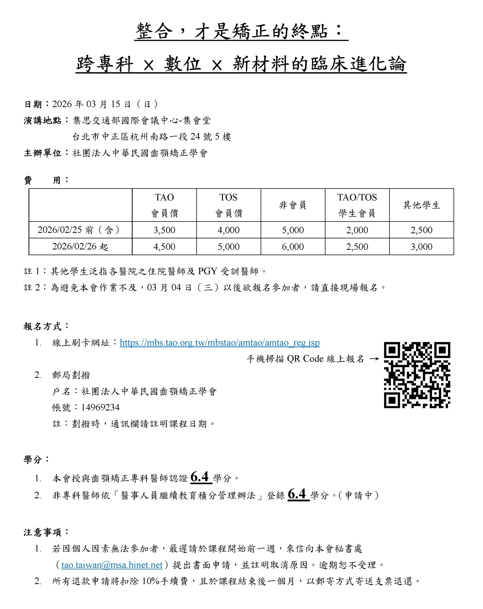 115年02月25日前(含),TAO會員3,500元、TOS會員4,000元、非會員5,000元、TAO/TOS學生會員2,000元、其他學生2,500元;115年02月26日起,TAO會員4,500元、TOS會員5,000元、非會員6,000元、TAO/TOS學生會員2,500元、其他學生3,000元。